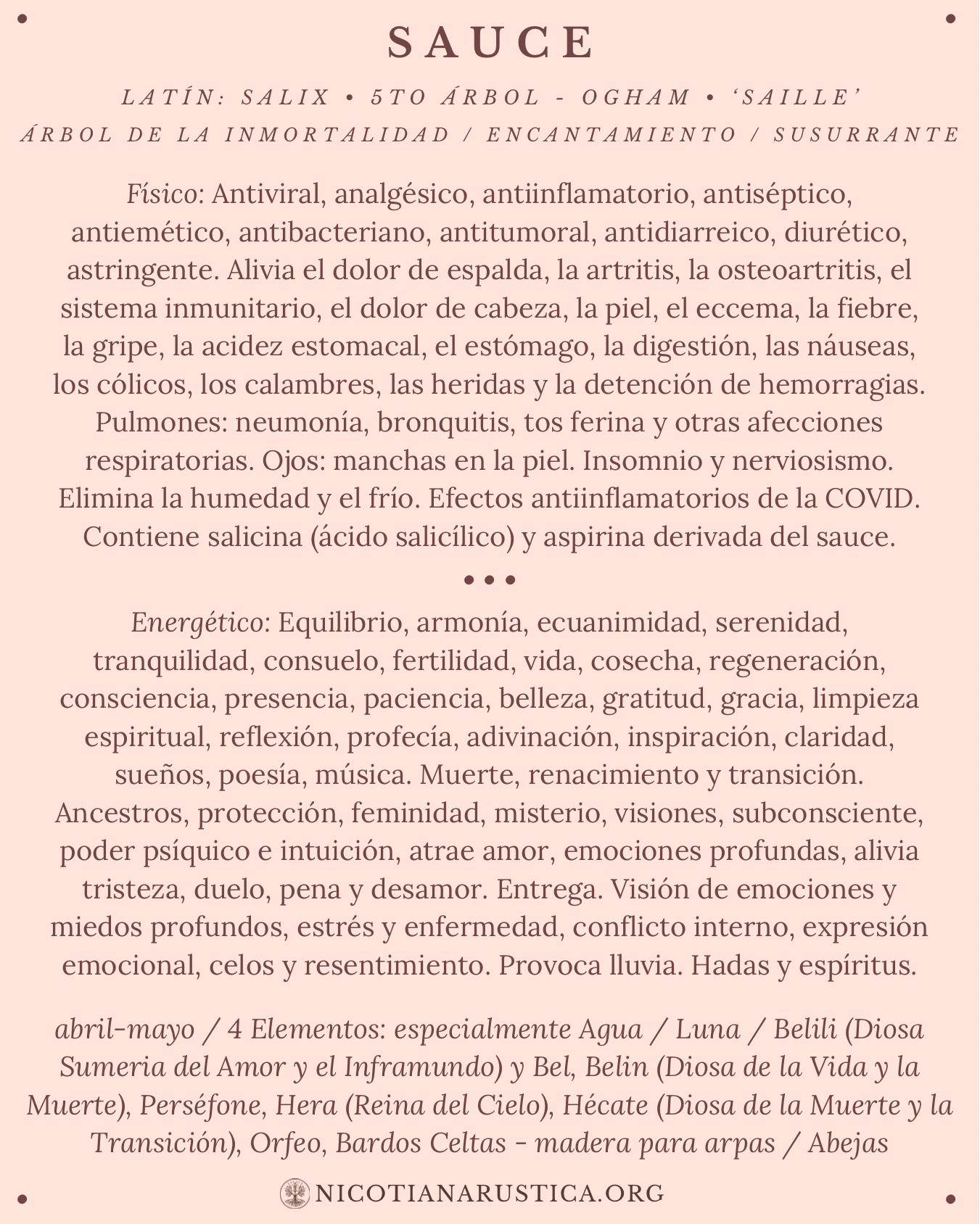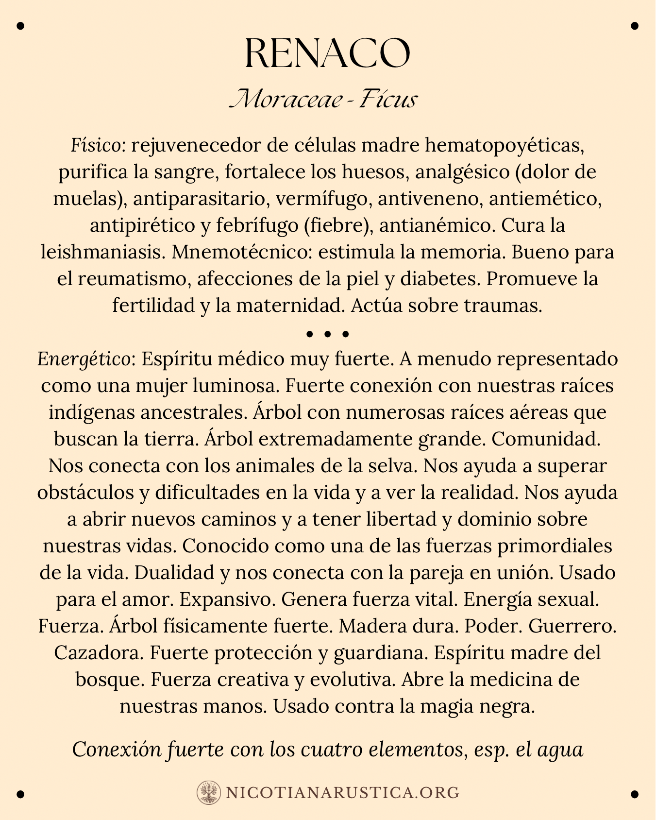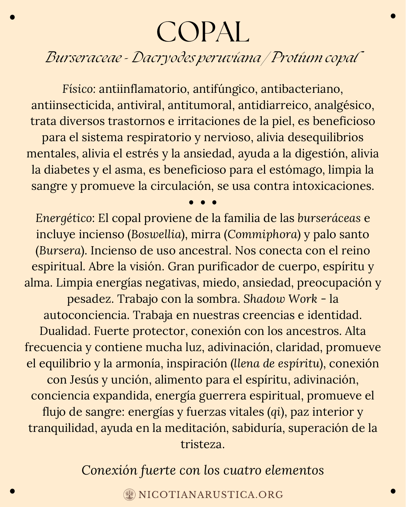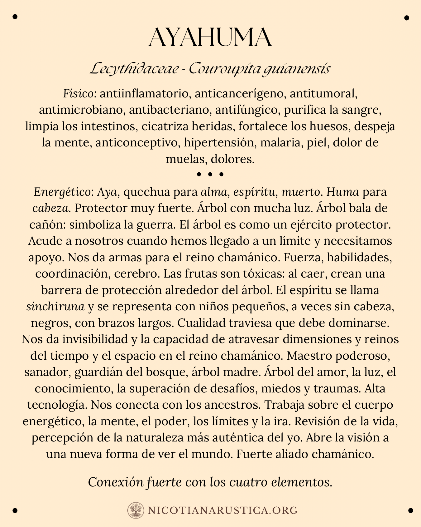 A continuación, compartimos una lista de algunas de las plantas y árboles con los que trabajamos. Aunque no es una lista completa, es amplia. La información aquí presentada no tiene la intención de diagnosticar ni tratar ninguna enfermedad, y es importante siempre trabajar de la mano de un profesional capacitado.